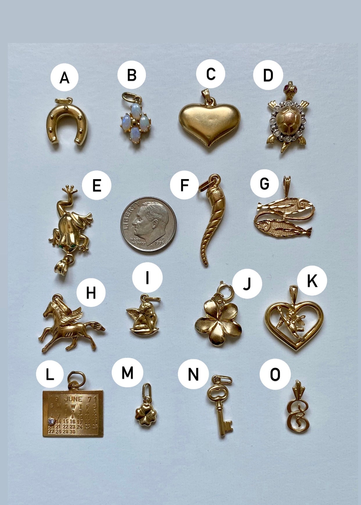 A lot of small gold charms available for purchase. Dime for size reference, please check the second picture for corresponding letters and choose the one you want in the drop-down: