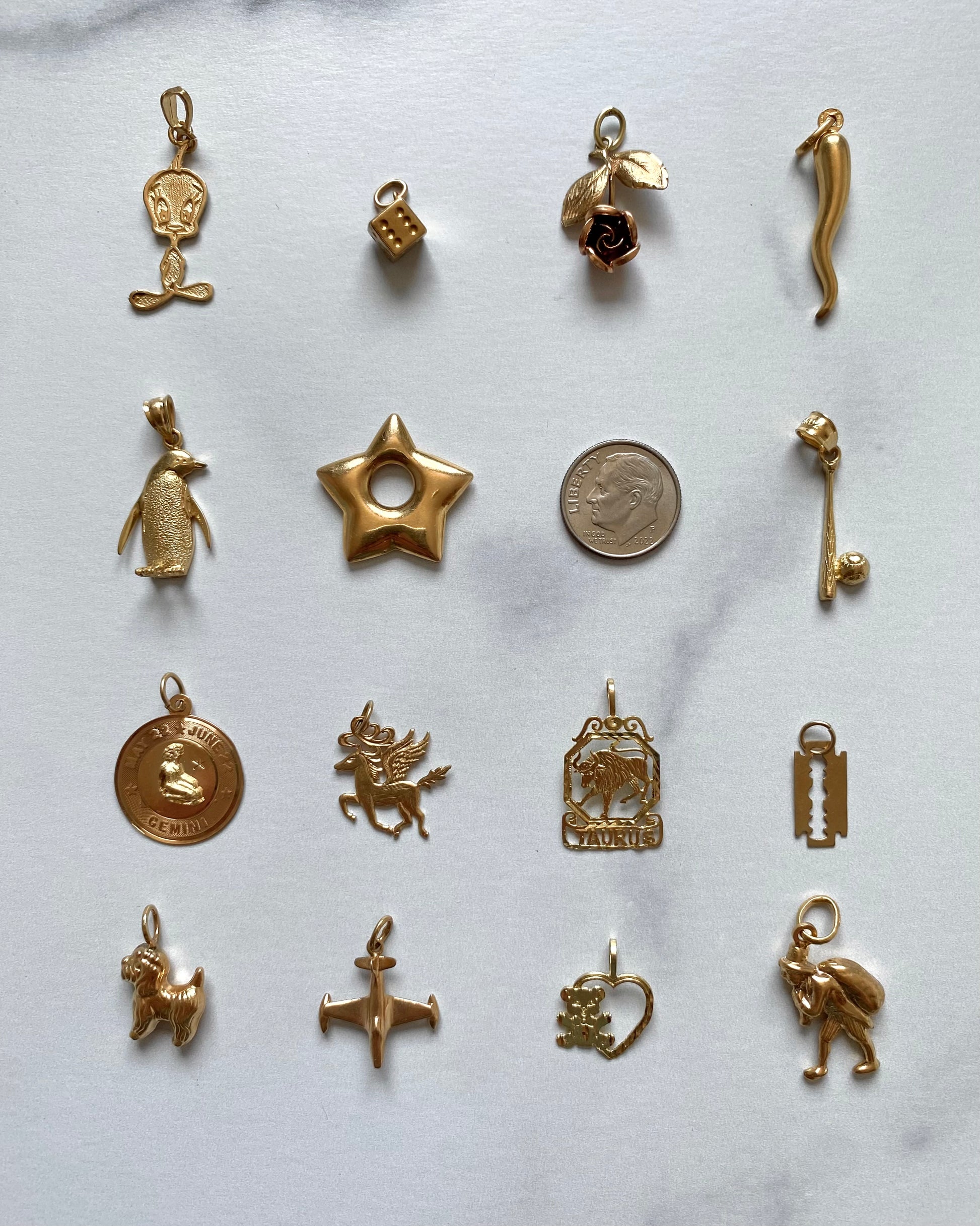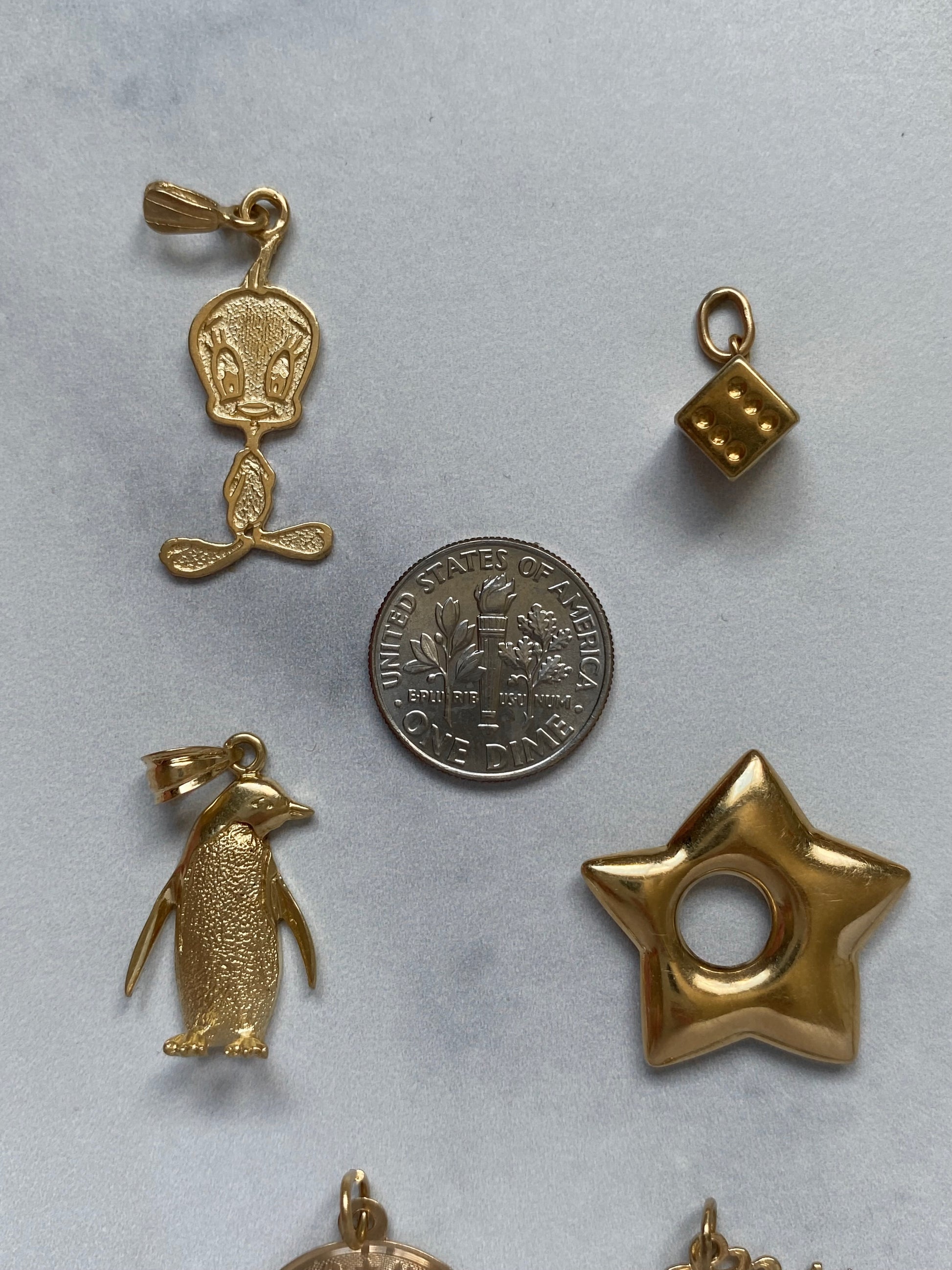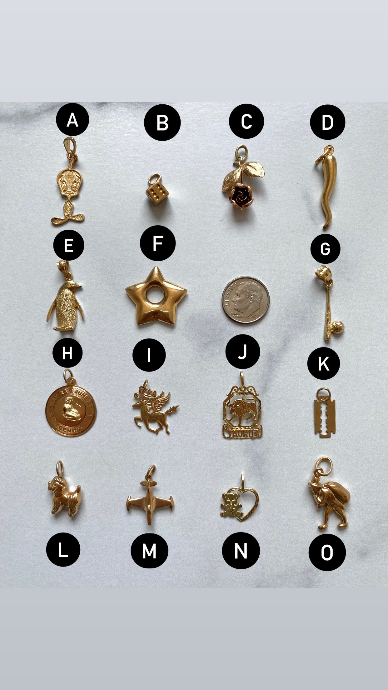 A lot of small gold charms available for purchase. Dime for size reference, please check the second picture for corresponding letters and choose the one you want in the drop-down: