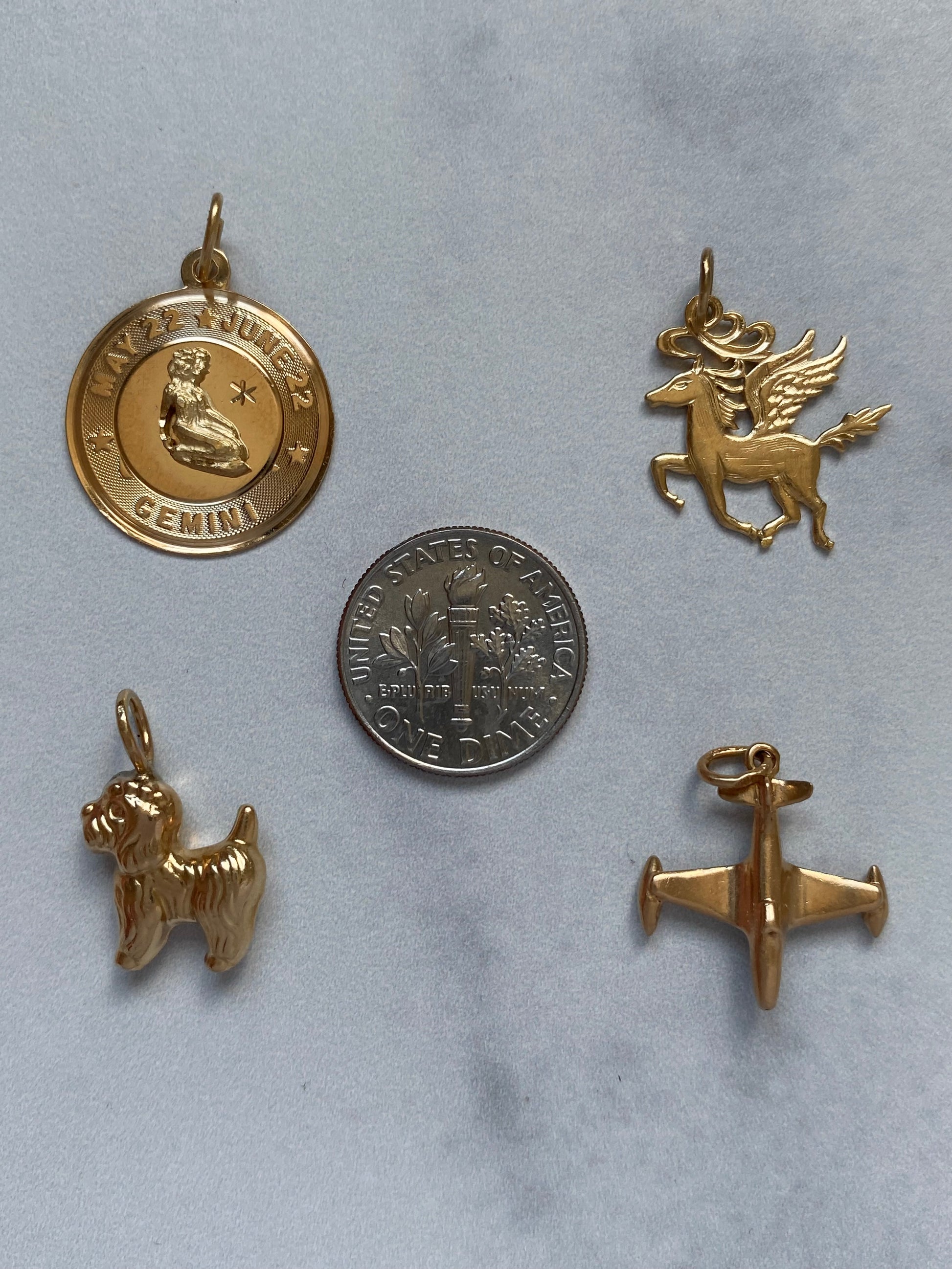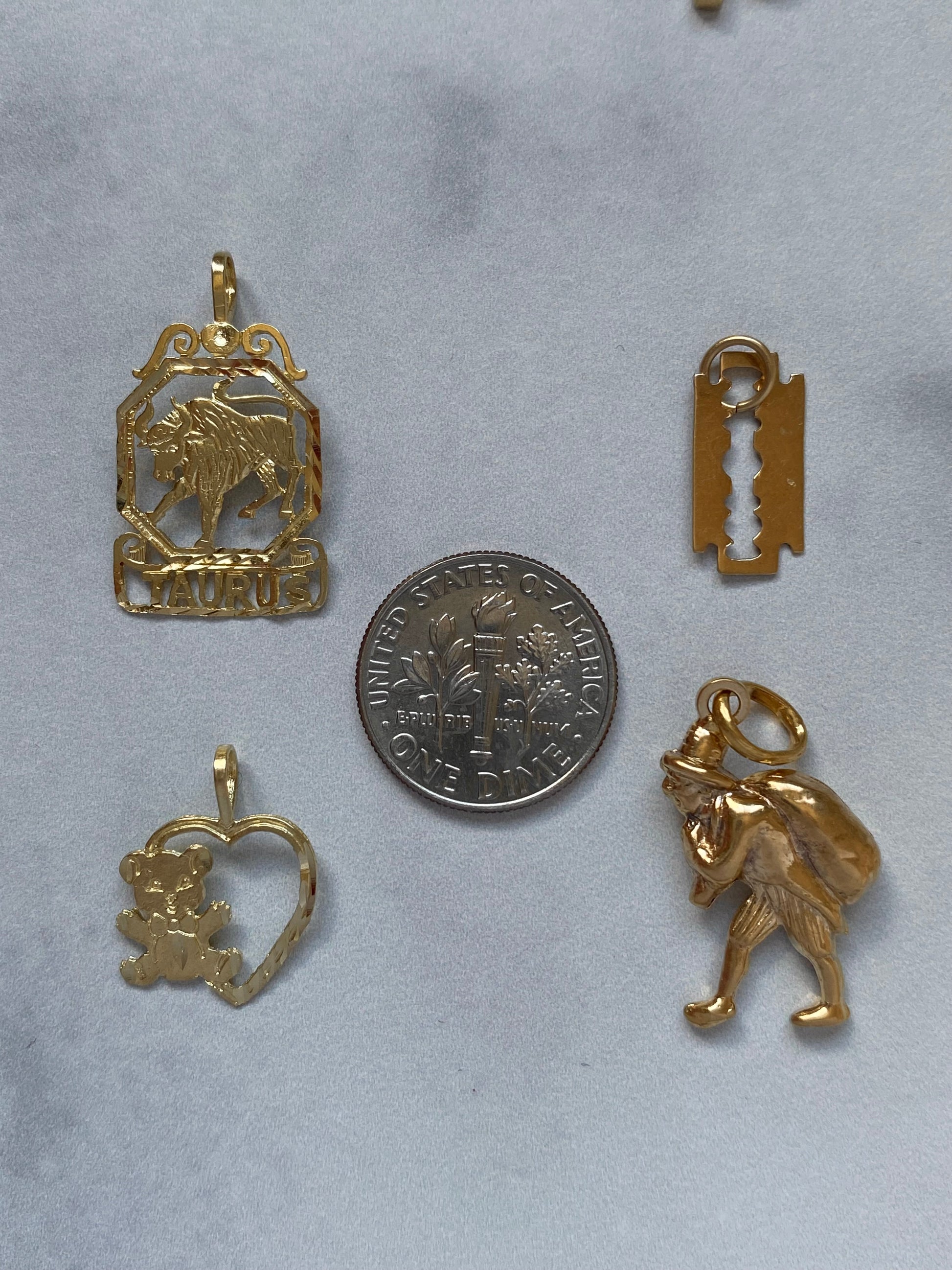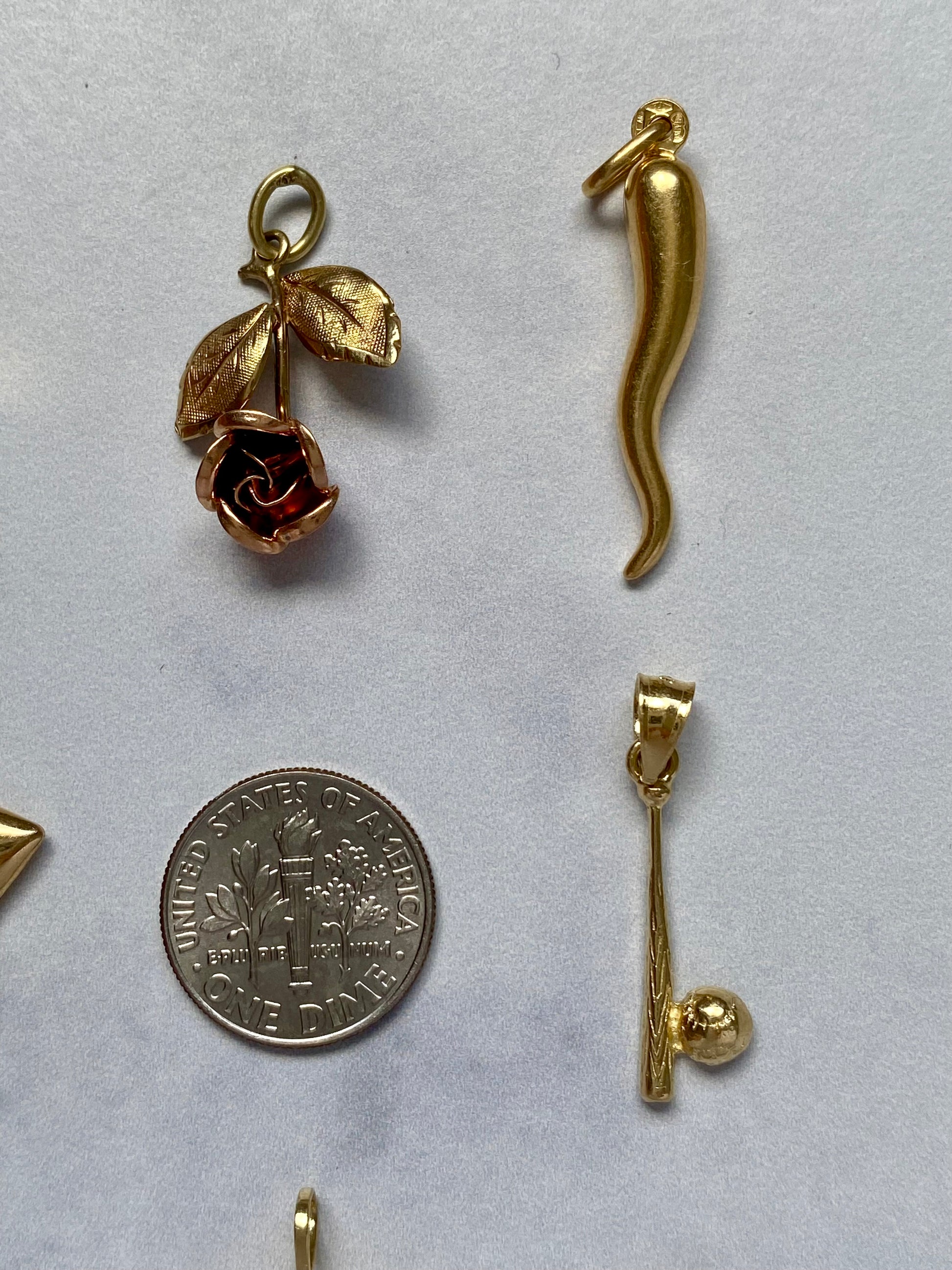 A lot of small gold charms available for purchase. Dime for size reference, please check the second picture for corresponding letters and choose the one you want in the drop-down: