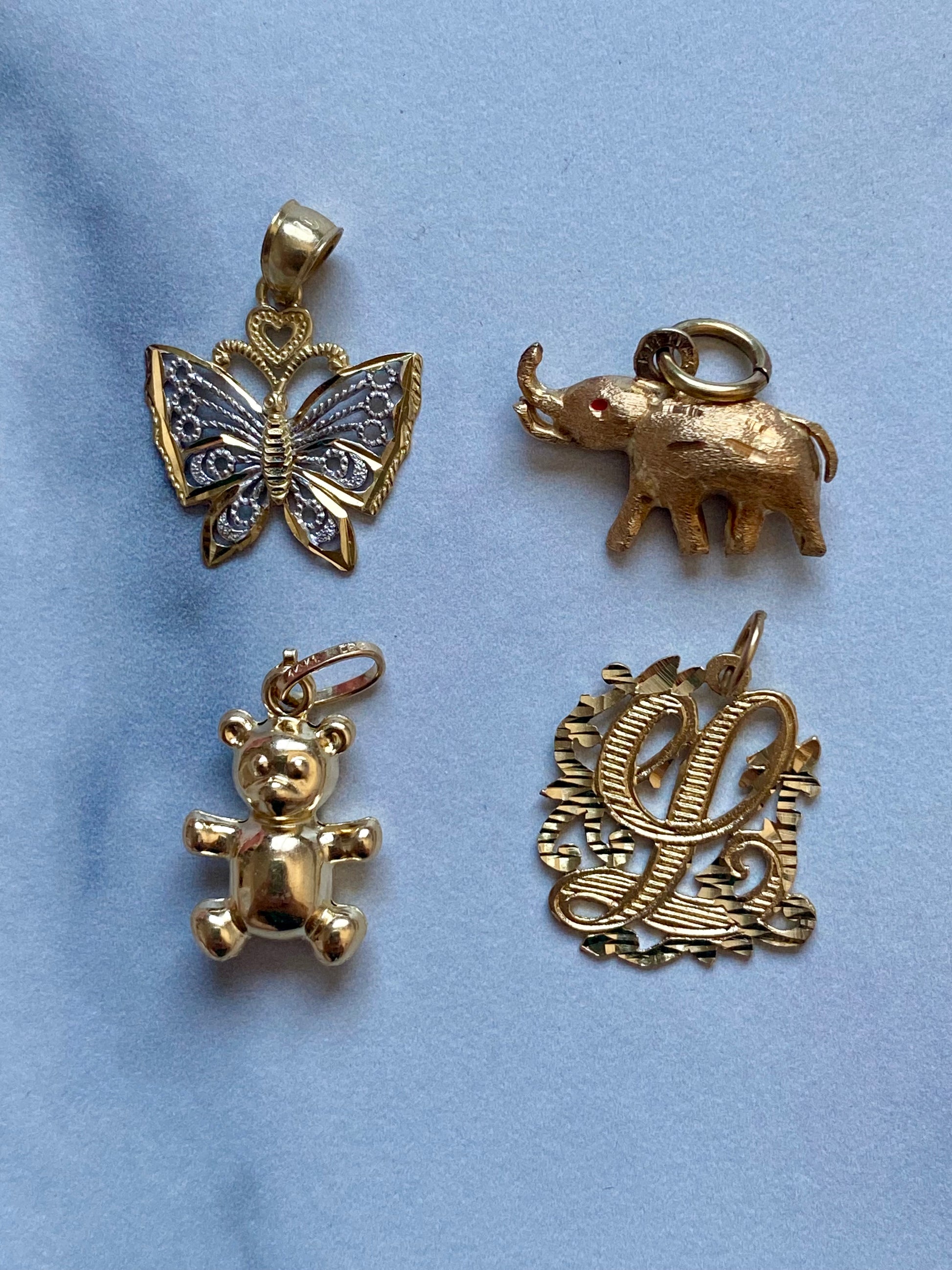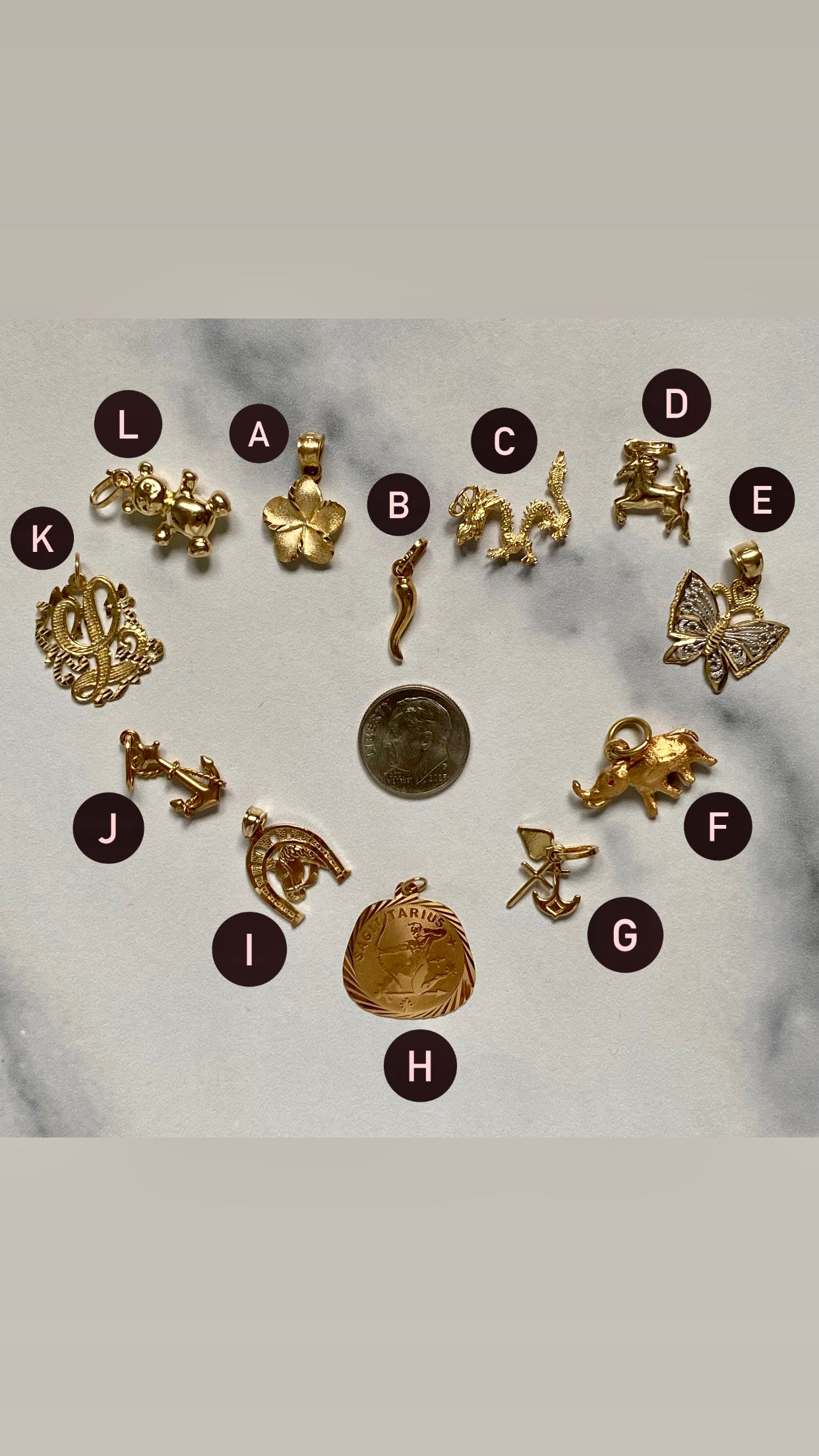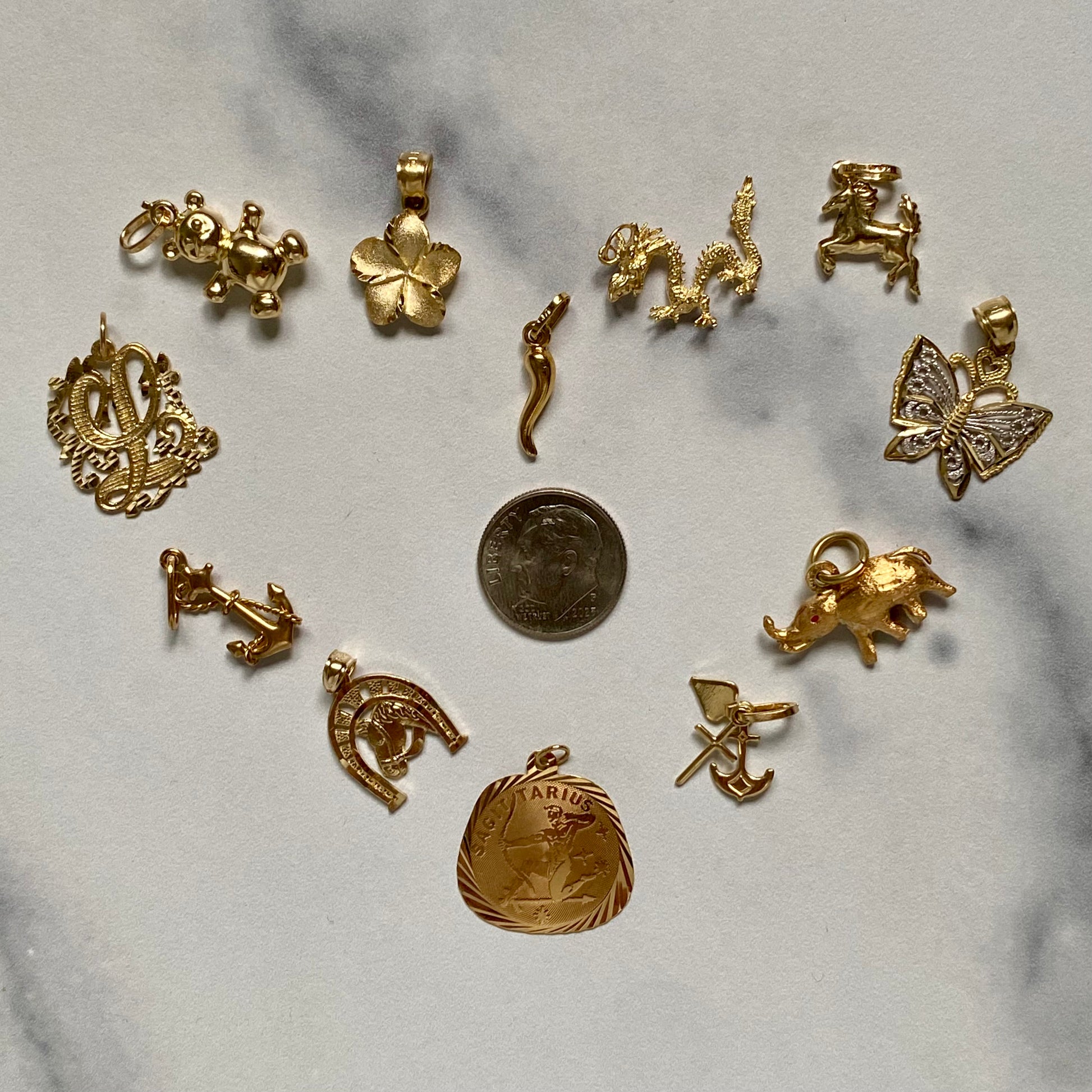 A lot of small gold charms available for purchase. Dime for size reference, please check the second picture for corresponding letters and choose the one you want in the drop-down: